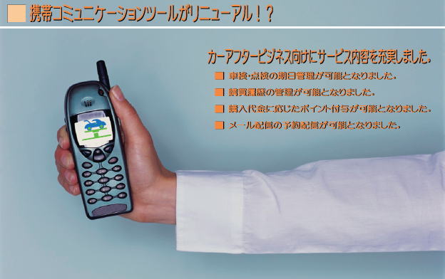 「E-xs:TIO」として誕生した、携帯電話を活用した「囲い込みシステム」は、1周年目にしてリニューアルしました。その名も「SSギア」です。SSギアは、携帯電話を熟知したNECモバイリング社が開発した「お客さまにお店の想いを伝えるメール配信サービス」です。 今までE-xs:TIOではできなかった、車検期日管理などの顧客対応サービスが可能になった、カーアフター業界にマッチした最新のシステムです。 |