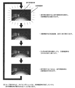 このナイトビューは、ナイトビューカメラからの映像に歩行者検知機能・注意喚起機能を追加して新しく開発されたファイングラフィックメーターと呼ばれるコンビネーションメーター内に表示されます。主に郊外の比較的暗い道路環境で車両前方約15°以内、距離は約40~100mの間で車速に応じて範囲を変化させながら歩行者を検知します(図5)。なお、歩行者の身長などにより検知範囲が異なる場合があります。 ①歩行者検知機能 歩行者検知機能とは、ナイトビュー映像に検出された歩行者位置を強調枠表示することでドライバーに車両前方の歩行者に対する認知を支援する機能です。ナイトビューの作動中に歩行者検知機能は作動しているかどうかを知らせるインジケータを表示します(図6)。 ②注意喚起機能 注意喚起機能とは、ナイトビュー映像に歩行者検知枠・注意喚起枠を点灯・点滅させることで、ドライバーの視覚に注意を促がす機能です。歩行者検知枠は、ナイトビューが歩行者を検知した場合に点灯し、その歩行者が検知されなくなるまで歩行者に追従して表示されます。また注意喚起枠は、歩行者が一人も検知されていない状態で新たに歩行者が検知された場合に表示されます。3回の点滅を繰り返した後、映像内に歩行者が検知されなくなるまで点灯を継続します(図7)。 ③ナイトビューの作動条件 ナイトビューは、夜間にナイトビュースイッチをONすることで作動します。またシフトポジションがR(後退)のときはバックガイドミニターとの混同を避けるため画面は表示されません。 ナイトビュー作動条件は、ヘッドランプON、ナイトビュースイッチON、IG ONで、薄暗い状態で車速が約15~約60㎞/hのときには近赤外線投光器は点灯しますが、歩行者検知機能は動作しません。また暗い状態で車速が約15~約60㎞/hのときには近赤外線投光器は点灯して歩行者検知機能が動作します。 なお車速が約60㎞/hを超える場合は、薄暗い状態および暗い状態でも近赤外線投光器は点灯しますが、歩行者検知機能は動作しません。 ④ナイトビューの表示画面 ナイトビューは、コンビネーションメーターのカラーTFT液晶ディスプレイに、図8のように表示されます。また、歩行者検知は、図9のような処理を行って歩行者を検知します。 |