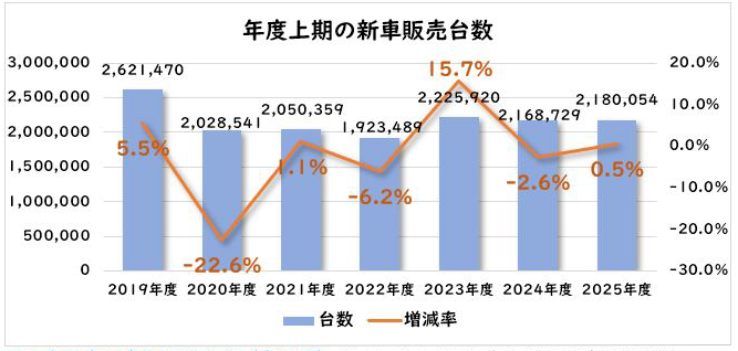 2025年度上期新車販売は微増 業界団体がまとめた2025年度上期(4~9月)の新車販売台数は、登録車と軽自動車の合計で218万54台と2年ぶりに増加したものの、増加率は0.5%にとどまった。認証不正のあったダイハツ工業が本格的に商品供給を再開するなどプラス材料もあったが、最大のシェアを持つトヨタの販売が減少。ホンダや日産自動車も振るわなかった。コロナ禍前の水準への回復は遠い。 ![]() 日本自動車販売協会連合会(自販連)がまとめた25年度上期の新車登録台数は、前年同期比1.8%減の137万2331台と、上期として2年連続で減少した。ブランド別ではトヨタが同1.0%減となったほか、ホンダが同17.8%減、日産が同17.1%減と、上位3ブランドが減少した。特にホンダ、日産の落ち込みが大きかった。 一方、全国軽自動車協会連合会のまとめによると、軽自動車は前年同期比4.7%増の80万7723台と2年ぶりに増加した。スズキが前年同期比1.6%減、ホンダが同3.4%減となったが、ダイハツが同28.7%増と大幅に増加した。ダイハツは認証不正による一時生産停止により、24年度上期は24.4%減と落ち込んでいた。今年度はそのマイナスを取り戻した格好だ。 登録車と軽を合わせた総台数では、トヨタ、日産、ホンダ、レクサスが減少。トヨタは前年同期比0.4%と微減だが、ホンダが同11.6%減、日産が同16.5%減となった。日産はダイハツに抜かれ、前年同期に4位から5位に後退した。一方、スズキは同3.5%増、ダイハツが同28.5%増となったほか、マツダや三菱自動車、スバルも増加した。 上期はかろうじて前年並みを維持した新車販売台数だが、9月は登録、軽ともに3カ月連続のマイナスとなり、総台数も前年同月比2.4%減の42万8214台と3カ月連続で減少した。ブランド別では、トヨタが同4.9%減、ホンダが6.2%減、日産が21.6%減と登録車の上位メーカーがいずれもマイナスだった。半面、スズキは7.3%増、ダイハツが6.4%増と軽が主力のメーカーはプラスを維持した。